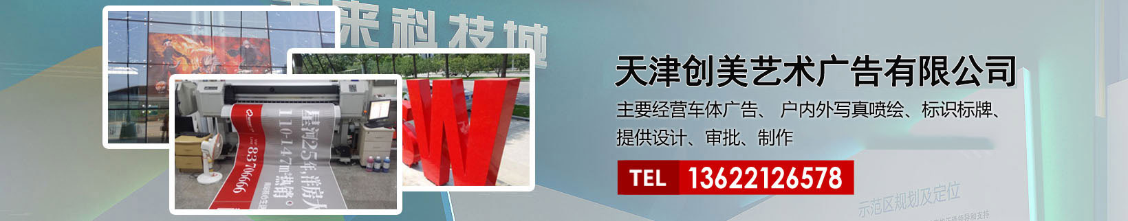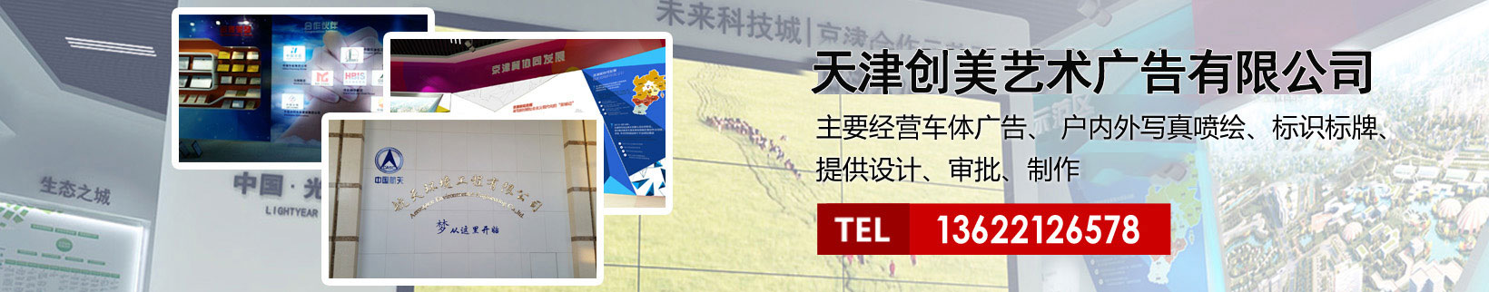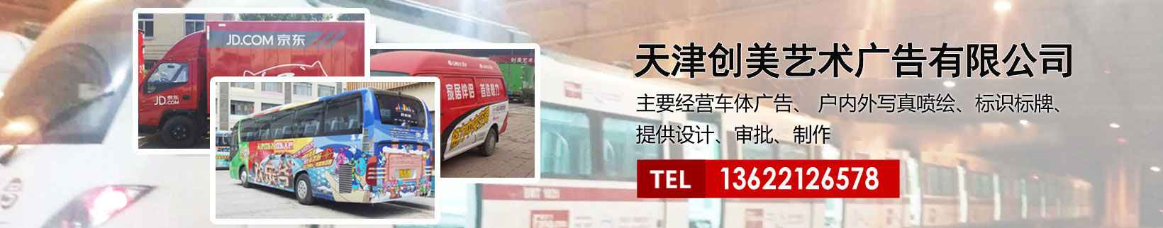 天津創(chuàng)美藝術(shù)廣告有限公司主要經(jīng)營車體廣告、 戶內(nèi)外寫真噴繪、標(biāo)識標(biāo)牌、提供設(shè)計(jì)、審批、制作、發(fā)布的服務(wù)。